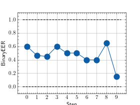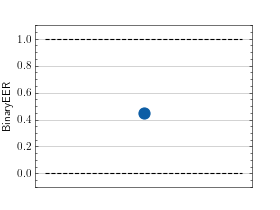 \[\text{EER} = \frac{\text{FAR} + (1 - \text{FRR})}{2}, \text{where} \min_t abs(FAR_t-FRR_t)\]The Equal Error Rate (EER) is the point where the False Positive Rate (FPR) and True Positive Rate (TPR) are equal, or in practise minimized. A lower EER value signifies higher system accuracy.