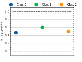 >>> preds = torch.tensor([[0.90, 0.05, 0.05], ... [0.05, 0.90, 0.05], ... [0.05, 0.05, 0.90], ... [0.85, 0.05, 0.10], ... [0.10, 0.10, 0.80]]) >>> target = torch.tensor([0, 1, 1, 2, 2]) >>> eer(preds, target, task='multiclass', num_classes=3, ) tensor([0.0000, 0.4167, 0.4167])