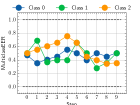 >>> # Example plotting multiple values >>> import torch >>> from torchmetrics.classification import MulticlassEER >>> metric = MulticlassEER(num_classes=3) >>> values = [ ] >>> for _ in range(10): ... values.append(metric(torch.randn(20, 3), torch.randint(3, (20,)))) >>> fig_, ax_ = metric.plot(values)