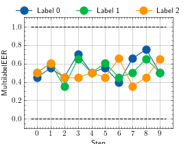 >>> # Example plotting multiple values >>> import torch >>> from torchmetrics.classification import MultilabelEER >>> metric = MultilabelEER(num_labels=3) >>> values = [ ] >>> for _ in range(10): ... values.append(metric(torch.rand(20,3), torch.randint(2, (20,3)))) >>> fig_, ax_ = metric.plot(values)