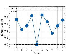 >>> from torch import rand, randint >>> # Example plotting multiple values >>> from torchmetrics.classification import BinaryF1Score >>> metric = BinaryF1Score() >>> values = [ ] >>> for _ in range(10): ... values.append(metric(rand(10), randint(2,(10,)))) >>> fig_, ax_ = metric.plot(values)