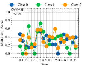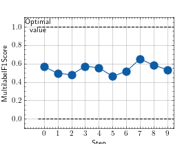 >>> from torch import rand, randint >>> # Example plotting multiple values >>> from torchmetrics.classification import MultilabelF1Score >>> metric = MultilabelF1Score(num_labels=3) >>> values = [ ] >>> for _ in range(10): ... values.append(metric(randint(2, (20, 3)), randint(2, (20, 3)))) >>> fig_, ax_ = metric.plot(values)