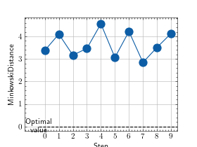 >>> from torch import randn >>> # Example plotting multiple values >>> from torchmetrics.regression import MinkowskiDistance >>> metric = MinkowskiDistance(p=3) >>> values = [] >>> for _ in range(10): ... values.append(metric(randn(10,), randn(10,))) >>> fig, ax = metric.plot(values)